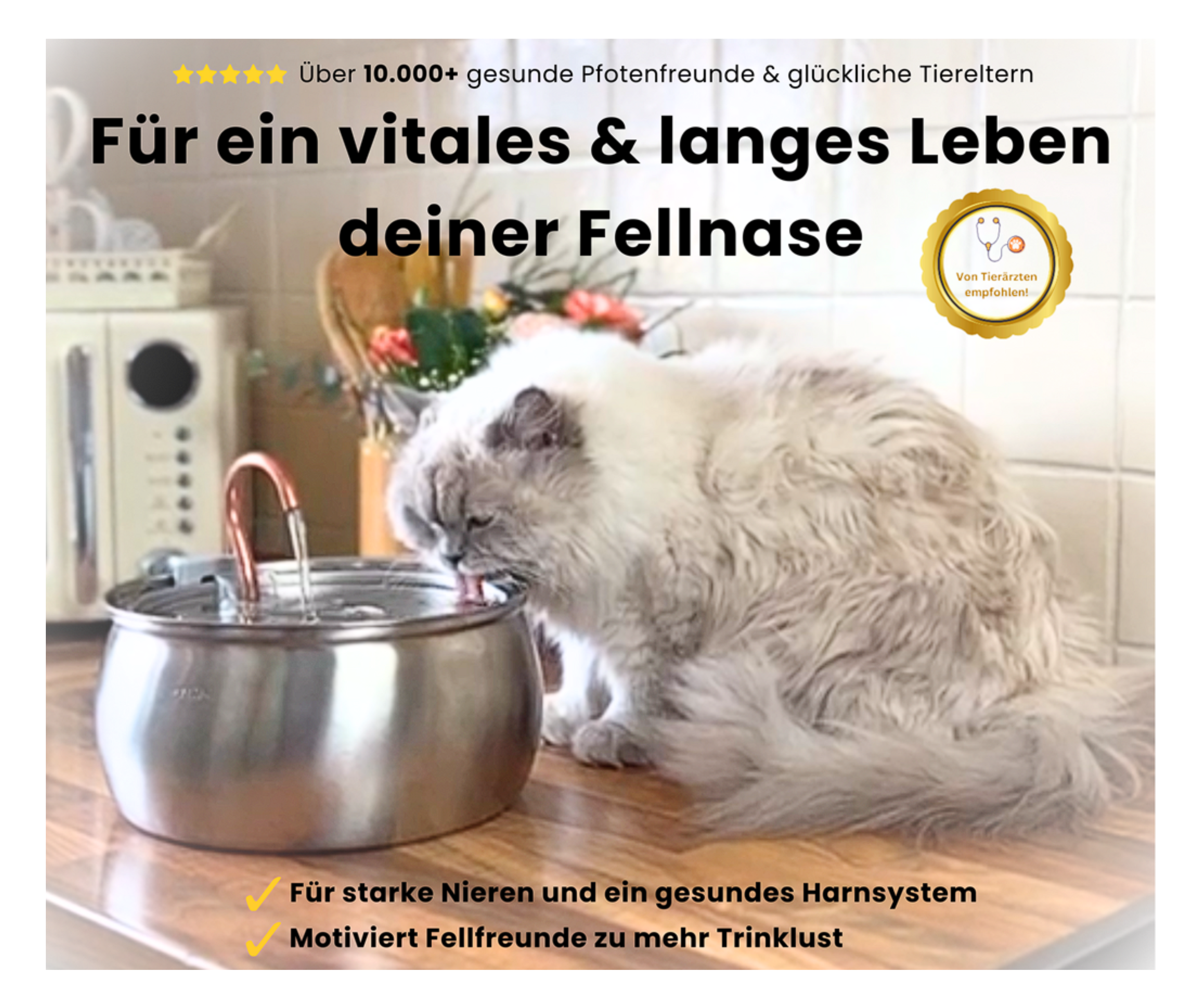 Katzen trinken oft zu wenig, besonders aus stehenden Wasserschalen. Ein Trinkbrunnen mit fließendem Wasser animiert sie zum Trinken und fördert ihre Gesundheit.